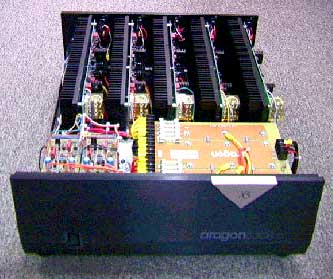Photo: 8008X5 with top panel removed.Notice the oversized, independent heat sinks for each channel and the massive space allocated on the bottom-right of the chassis for the power supply.