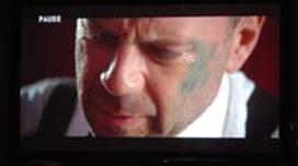 I hope these images can capture a small amount of the detail that is visible on the screen. The color richness and levels of black that can be seen in this movie is amazing. Yamaha's Cinema Black mode is by far the best setting to use when you are trying to get the most out of the LPX-510 projector. If you look closely at the close up of Bruce Willis you can really see the detail of his eyelashes and the subtle textures of his skin. In the 5 megapixel master shots you can zoom in all the way and simply not see any pixel breakup in the images, including the explosion.