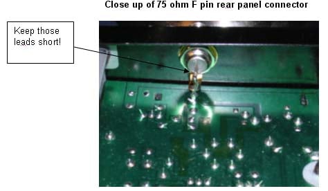 As I previously noted in this article the board layout is single sided and ground plane in the unit has been sacrificed to accommodate a single sided board. The main ground to the chassis appears to be a chassis support bracket that goes down between the RF section & the rest of the unit. I added ground straps using 1/8 inch flat braid from the return of the power supply to the chassis. From the return of the power supply I added a ground strap that went to small ground plane near the audio output. From there a ground strap was connected to a small ground plane of the IF section. From that same ground plane in the audio output section I added another ground strap to ground plane next to the bracket. The very last thing was to install a 75 ohm F pin connector for the RG6 cable run from the antenna. When the Yamaha T-80 was produced Yamaha used their own custom 75 ohm connector and these parts are no longer available. Note from the photo the short lead length down to the P.C. Board.