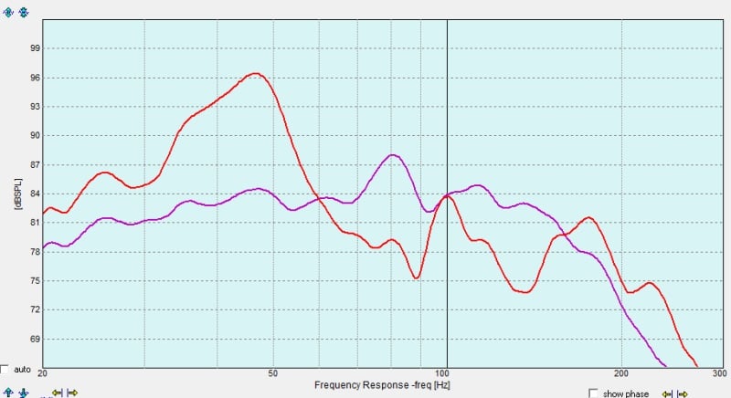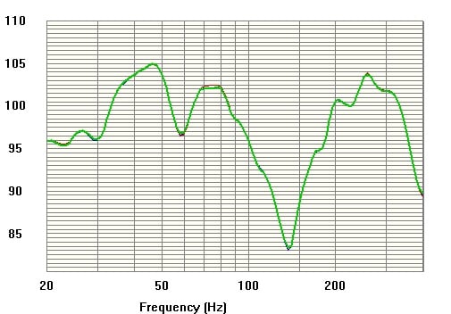 I noticed two anomalies when using Quick Measure. First, it always showed a giant rise in frequency response above the actual response of the subwoofer (see the sudden rise above about 140Hz in the image on the right). Second, it showed the frequency response before calibration, even if equalization was currently being used on the subwoofer.