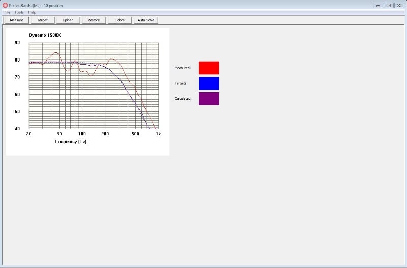 After I had taken a series of before and after measurements, I compared the results shown in the software versus what I measured. After calibration, PBK shows the measured response before calibration (red), the target curve (blue), and the actual calculated response after EQ has been applied (purple).