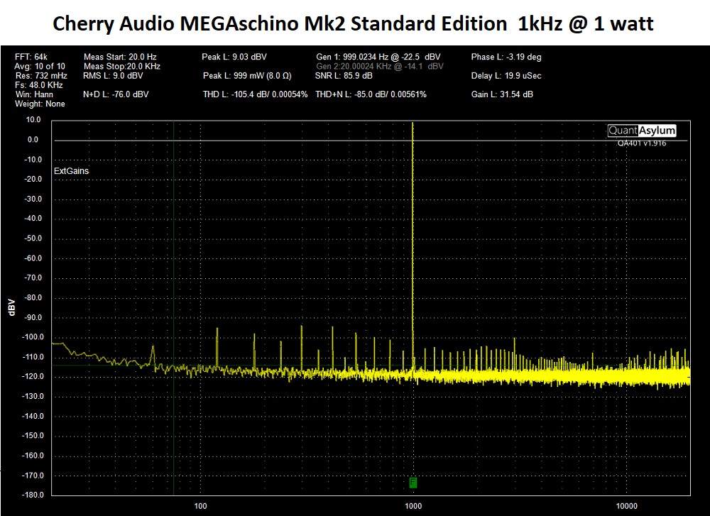 First, looking at the 1 watt 1Khz FFT (64K with 10 averages), we see a few interesting properties. First, the basic noise floor is around -110 to -120dB with an overall noise plus distortion noise floor of -76 dBV. THD+N came in at .0056% (-86dBV) and THD came in at a much lower .0005% (-105.5 dBv). Why such a difference? Where is the noise coming from? Well, that became more obvious throughout all testing and shows that one of the upgrades for the Cherry amplifier is probably worth buying. Power supply noise was significant relative to the noise floor, with the highest being the harmonics between 120hz and 800hz, but actually extending well past 1khz. Still, at 1 watt the spurs all fell below -90dBV, so maybe I am being too critical. I didn’t hear any obvious hum in use, but I would have liked to see less power supply noise in the measurement. Moving onto the S/N at 1 watt into 8 ohms, we see it comes in at 85.9 dB. That is decent performance for such an amplifier, not the best in the business, but certainly better than you see with lots of lesser amplifiers. I believe this spec would improve substantially with the optional power supply upgrade which was not tested here.