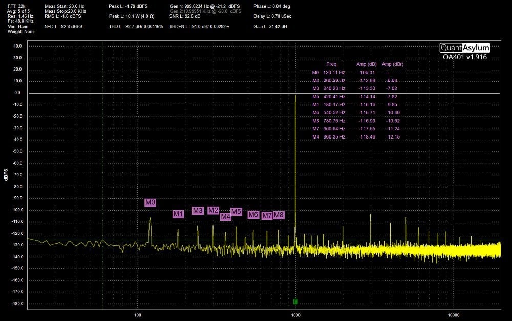 What about high power testing you ask? Well, as noted, I couldn’t test the amplifier at high power levels, so instead, I tested the amplifier at various power levels until I hit a point where I was certain I was overloading the input of the analyzer. Again, changes are being made to the test rig to allow higher margins, but for now, these are the best I can do. For high power testing, I switched to 4 ohms, as this gave greater margins. Distortion goes up into 4 ohms with this amp, as with most amplifiers, so consider that into 8 ohms, it will achieve at least half these power levels with measurably lower distortion (and Cherry’s own AP results confirm this). At 10 watts, THD+N is .0028% (-91dB) and THD is .0012% (-99dB). At 20 watts into 4 ohms, we see THD+N of .004% and THD of .002%. SNR at 10 watts was a good but not great 92.6 dB, again strongly impacted by power supply noise, with the 120hz power supply spur at -100dB. At 200 watts into 4 ohms, THD+N and THD both increased to around .007%. This means noise is no longer dominating the spec and THD starting to emerge as the dominant factor. At 270 watts distortion remains about the same, increasing to .008%. At the time of this test, the way the Q451 was setup also reflected the point at which the QA451’s own distortion rises to a similar level, and I lose confidence in any power results above this.