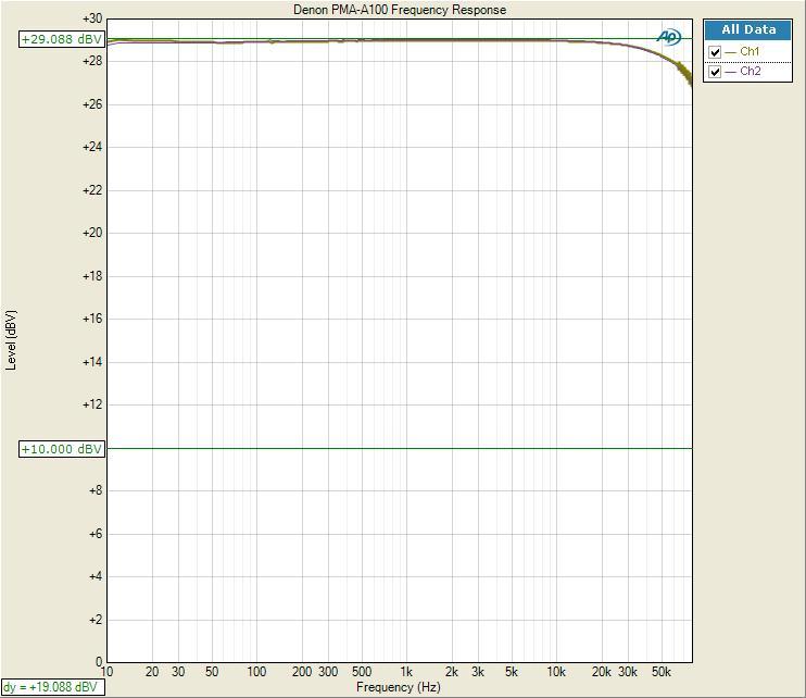 The Denon PMA-A100 exhibited ruler flat frequency response for the full audio bandwidth even when driven at 100wpc into 8 ohms which is above its 80 watt power rating. The -3dB point is around 80kHz which is the limit of the Audio Precision test equipment.