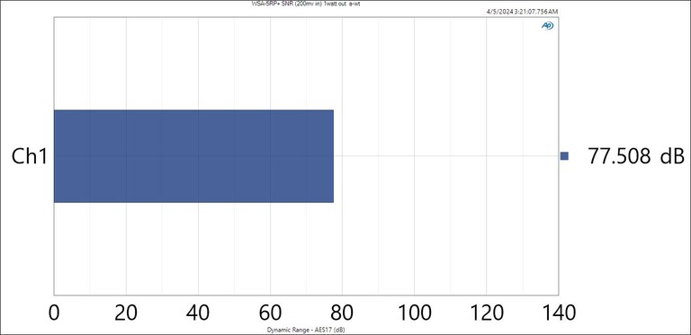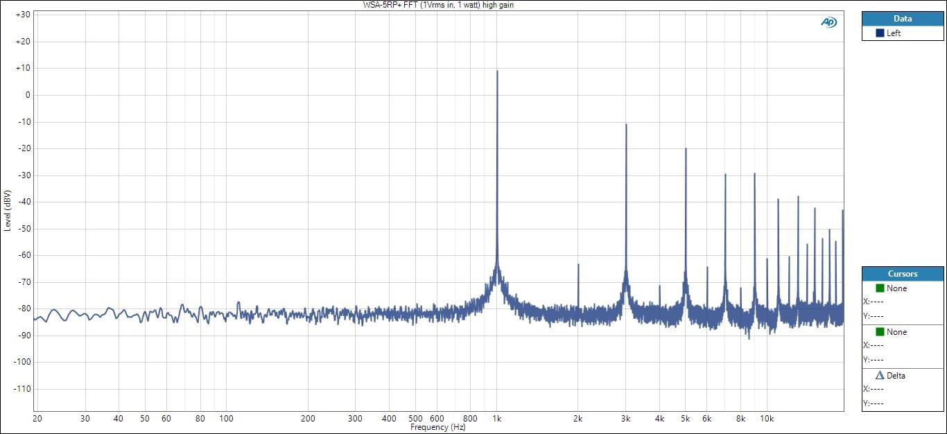 Given this amp is being fed a wireless audio signal, it is likely limiting the full low distortion potential of the design. The manufacturer rates SNR > 90dB presumably at full power (50 watts) which would translate to > 70dB SNR @ 1 watt. I actually measured 77dB SNR @ 1 watt (a-wt) which is pretty respectable considering this is through a wireless signal path.