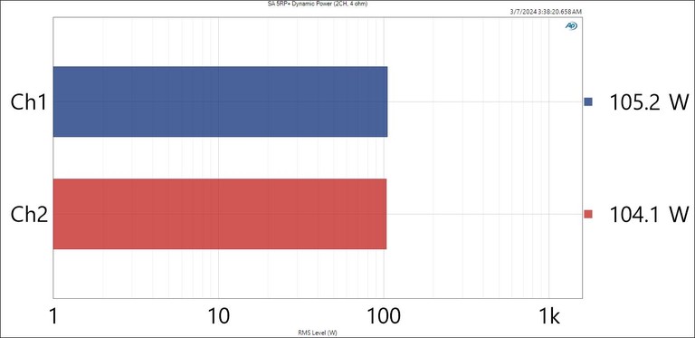 The Dynasty ProAudio amp delivered 54 watts/ch into an 8-ohm load and 104 watts/ch into a 4-ohm load of dynamic power at 1% THD+N which was similar to its power sweep results indicating the power supply doesn’t have much headroom which is typical with SMPS regulated power supplies found in many Class D amplifiers.
