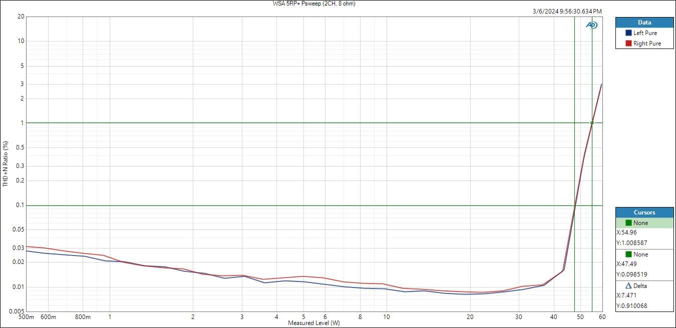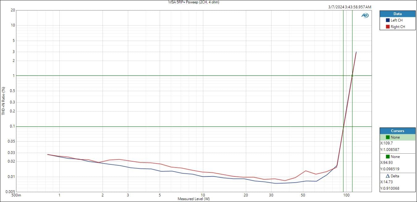 The Dynasty ProAudio amplifier was able to deliver 45 watts/ch with 2CH driven at < 0.1% THD+N. That’s a little shy of it’s 50 watt rating but they don’t specify bandwidth or distortion levels.