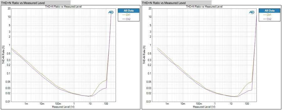 Comparing with the less costly UPA-200, the XPA-200’s performance is interestingly a bit of a mixed bag. As one might expect from the specs, the XPA-200 isn’t really capable of delivering much more clean output into an 8 ohm load than the UPA-200; distortion for both in the 1kHz sweep begins rising rapidly beyond the 100W mark. Moving to a 4 ohm load, the XPA-200 starts to slightly separate itself from its sibling, being capable of putting out a bit over 200W with <0.1% THD+N, while the UPA-200 falls shy of the mark. Into both 8 and 4 ohm loads, one might also note that the XPA-200 is a bit less noisy, and that it delivers flatter top end extension.