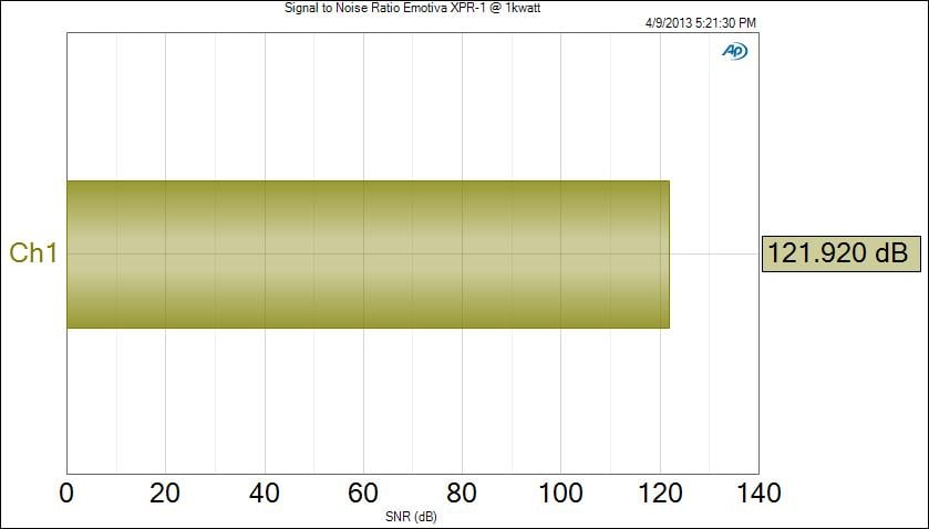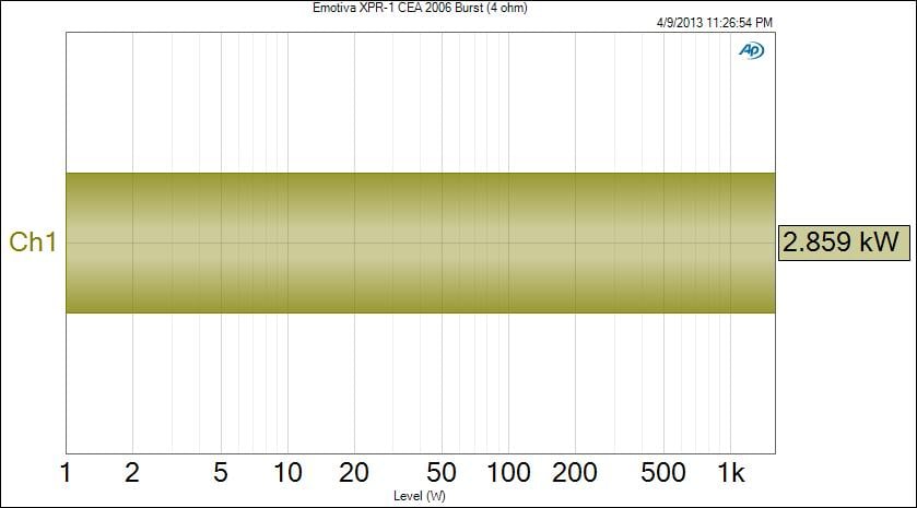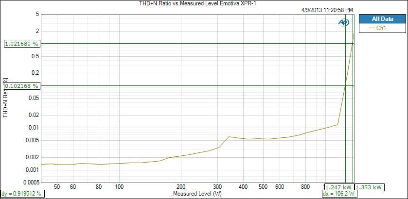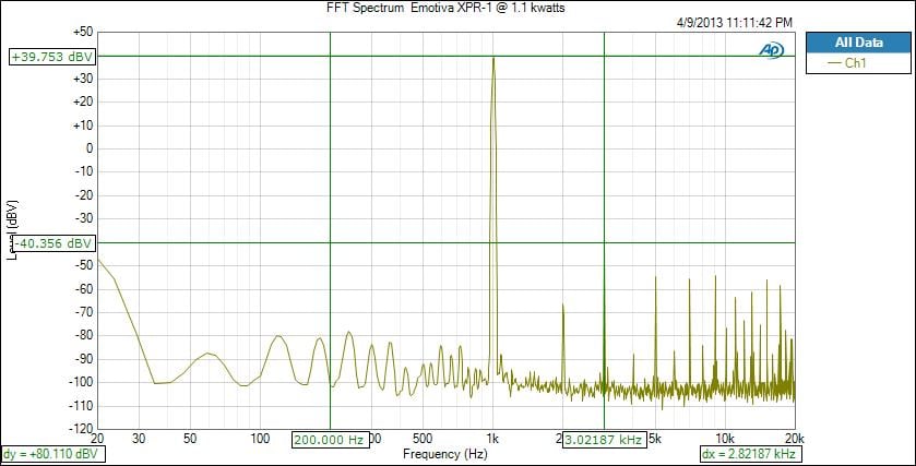 The Emotiva XPR-1 ripped through the 10Hz to 20kHz power sweep at 1 kilowatt like nobody’s business. I’ve never measured an amplifier that could produce 1 kilowatt full bandwidth before. Impressive, most impressive!