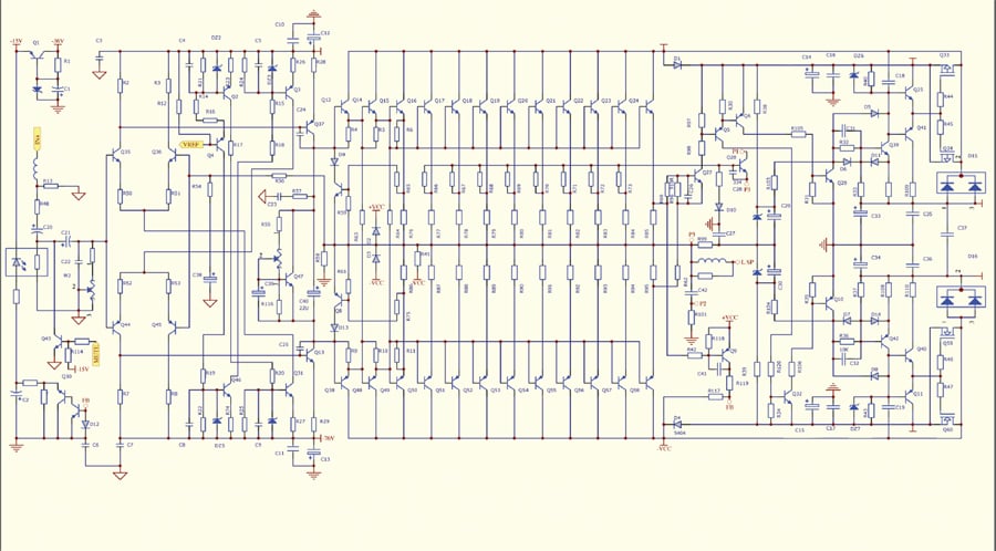 This circuit topology represents one half of the two differential amplifiers (mirror amplifier) with bipolar transistors. There are a total of 36 (18 per phase) 250 watt ON Semiconductor output devices in XPR-1 amplifier. By bridging two amplifier channels together and making the second channel of the bridged pair 180 degrees phase inverted, the load sees double the voltage compared to a single ended amplifier design. The positive cycle of the input wave is handled by upper amp and the negative cycle is amplified by the lower differential amp with 180 degree phase shift. The output of each differential amp (in upper & lower stage) is connected to the bases of bipolar transistor in the Darlington scheme shown in the figure. This configuration gives a much higher current gain. The resistors connected to the emitter of each transistor provide intrinsic feedback to control the currents flowing through the transistors. In addition, two differential op-amps are employed. The input signal is connected to the inverting and non-inverting pin of each op-amp. Depending on the polarization of the input signal (+/-) the output of one the op-amps would “turn on” while the other would “turn down” at the same time. The output signals of the op-amps would switch on/off the MOSFETs connected to the “high rail” potentials in order to synchronize the applied voltage to the input signal. This increases the efficiency of the circuit while avoiding any power loss. In other words, when the input signal amplitude goes high, the upper op-amp switches on the upper MOSFET connecting the upper high rail voltage to the circuit and amplifying the input signal. This circuit is an adaptive design.