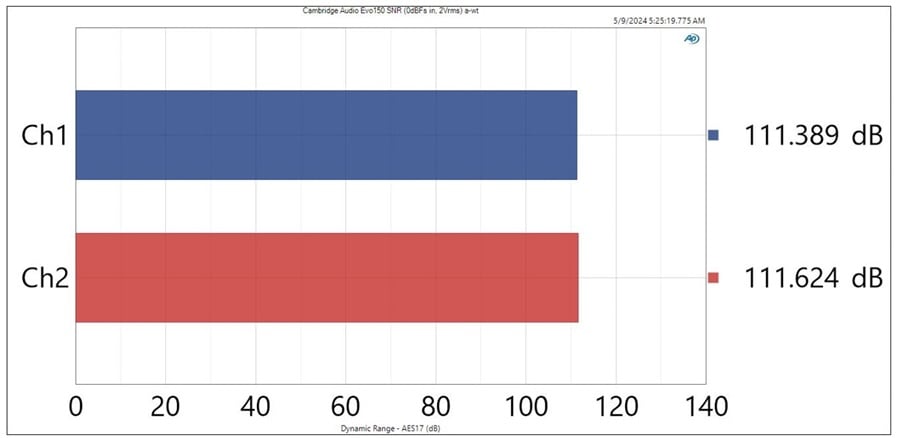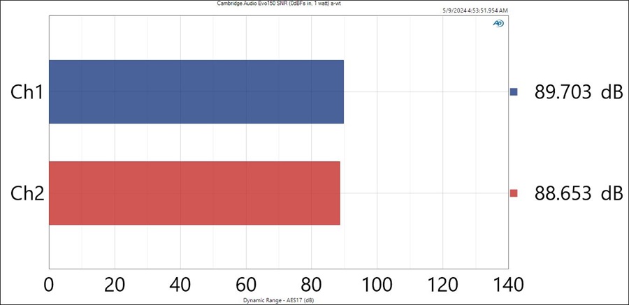 I always measure amplifiers at 1 watt so that apples to apples comparisons can be made between different products that have different maximum output capabilities. If you want to know the SNR at rated power, then you simply take the 1 watt rating and add 20* log (V*R)^1/2 / 2.83) where V = Vrms and R is the load. With a 0dBFs input signal, I measured 89dB (a-wt) at 1 watt (8 ohms) which is a very good figure. In comparison, the Arcam A25 measured about 5dB better under the exact same test conditions so it’s a little quieter than the Cambridge Audio EVO 150 which is about on par with the Yamaha R-N1000A I also recently measured.