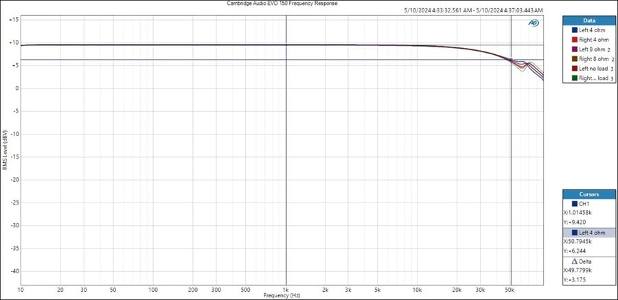 Cambridge Audio EVO 150 Frequency Response – no load, 8 ohms and 4 ohms