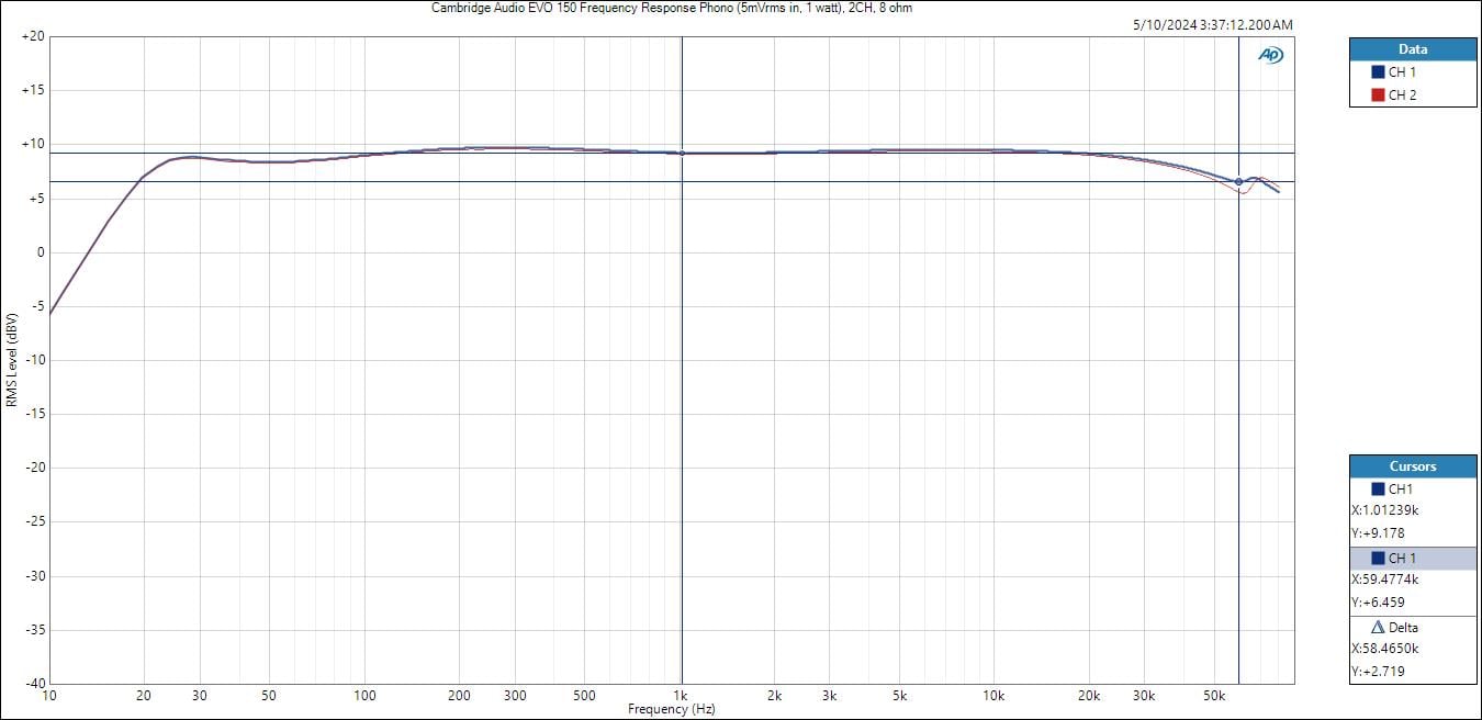 The EVO 150 exhibits extremely linear frequency response with -3dB points of 15Hz and 60kHz, respectively. It appears Cambridge Audio applied a shallow subsonic filter below 20Hz to help prevent turntable rumble.