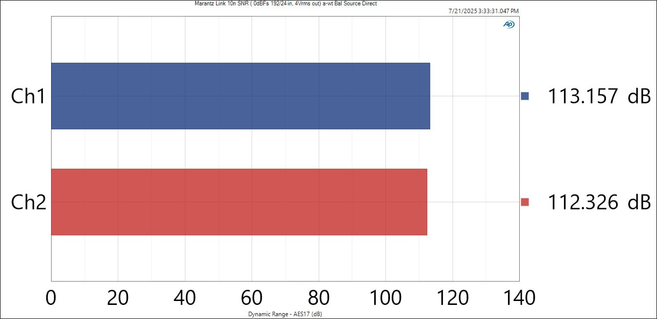 Marantz specs the balanced analog section as SNR of 122dB (A-wt) with a 4Vrms input and 3.16Vrms output from the balanced output and I was able to confirm the Link 10n beat their spec by 1.5dB! This is a superb result and shows off the prowess of a fully differential, low noise preamplifier.