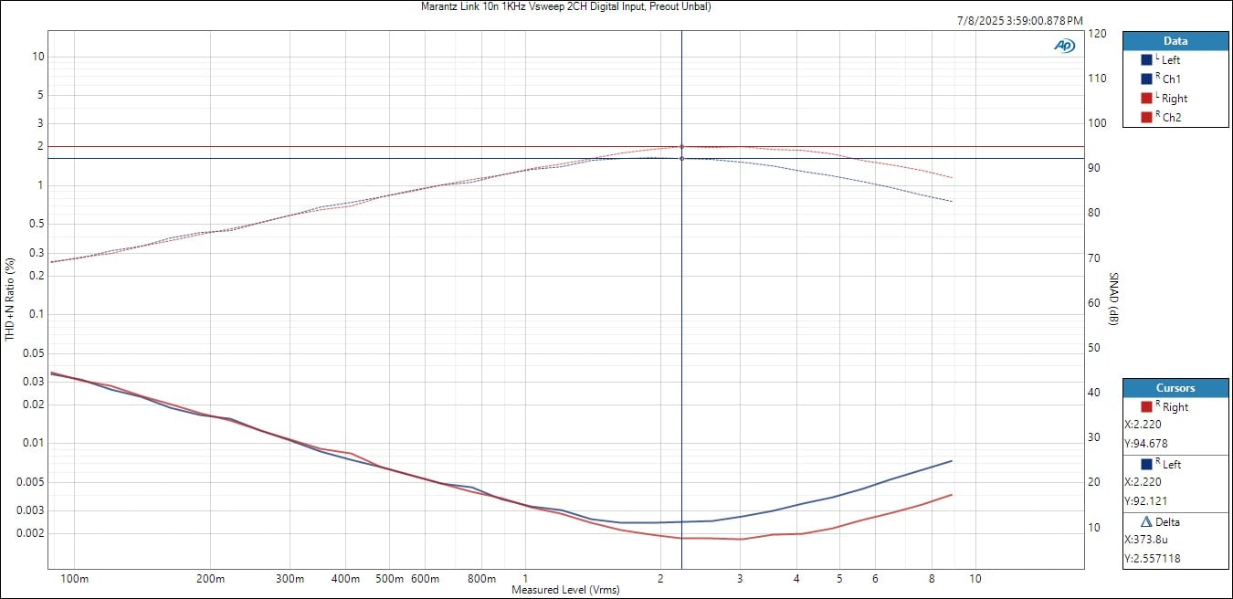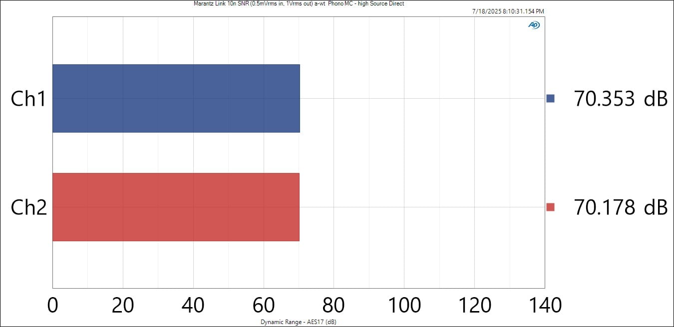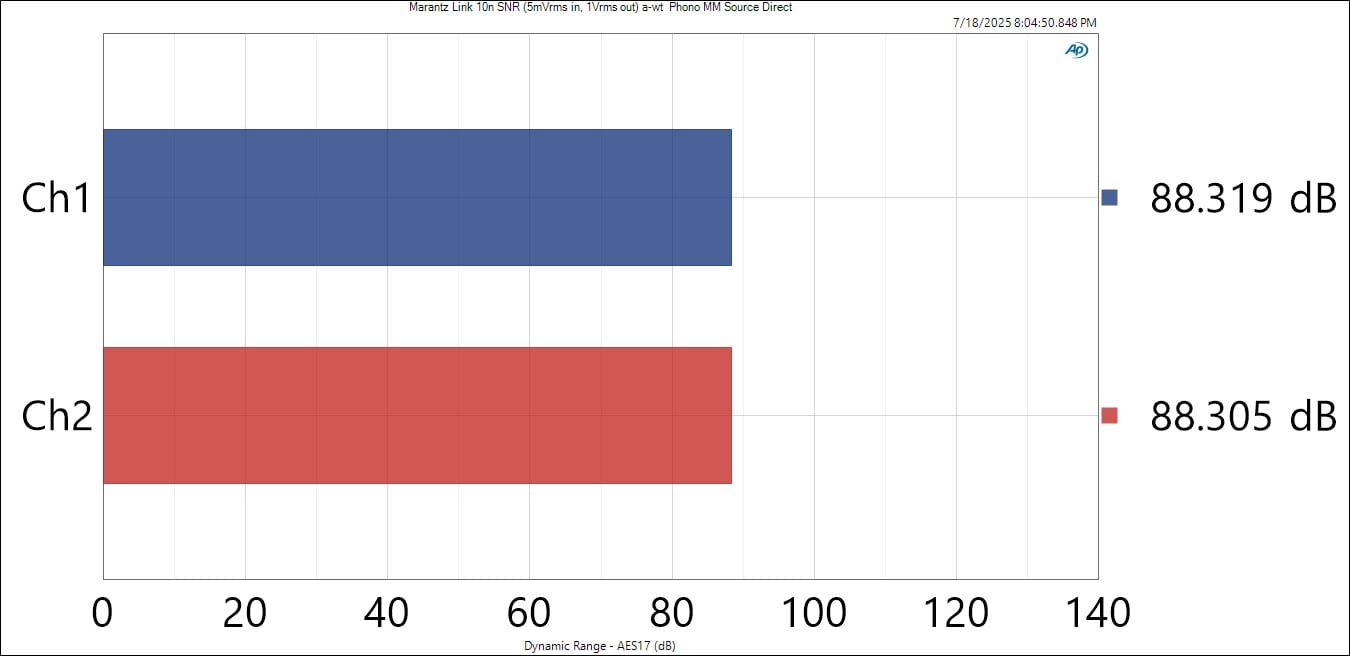 I measured 88dB SNR (A-wt) at 1Vrms or 2Vrms output via unbalanced or balanced outputs from the Link 10n which is very low noise performance for a phono preout and matches Marantz’s spec, but it’s still about 4dB worse than what I measured from the AV 10 15.4CH Preamp/Processor under the same test conditions.