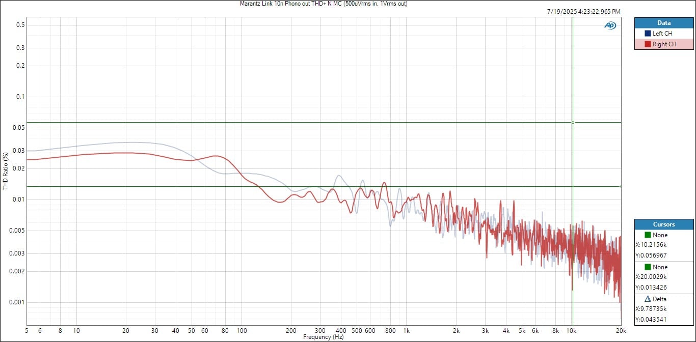 Marantz Link 10n MC Phono THD+N vs Frequency (0.5mVrms in, 1Vrms out)