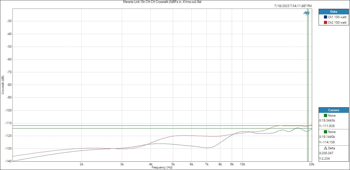 The channel to channel crosstalk on the link 10n was stellar as expected for a product of this caliber. I measured -140dB CH-CH isolation at 1kHz and >-114dB isolation at 20kHz. Anything > 60dB at 20kHz is what I consider to be sufficient for excellent stereo separation and minimal audible channel leakage. This type of isolation is among the best I’ve measured in a two-channel product.
