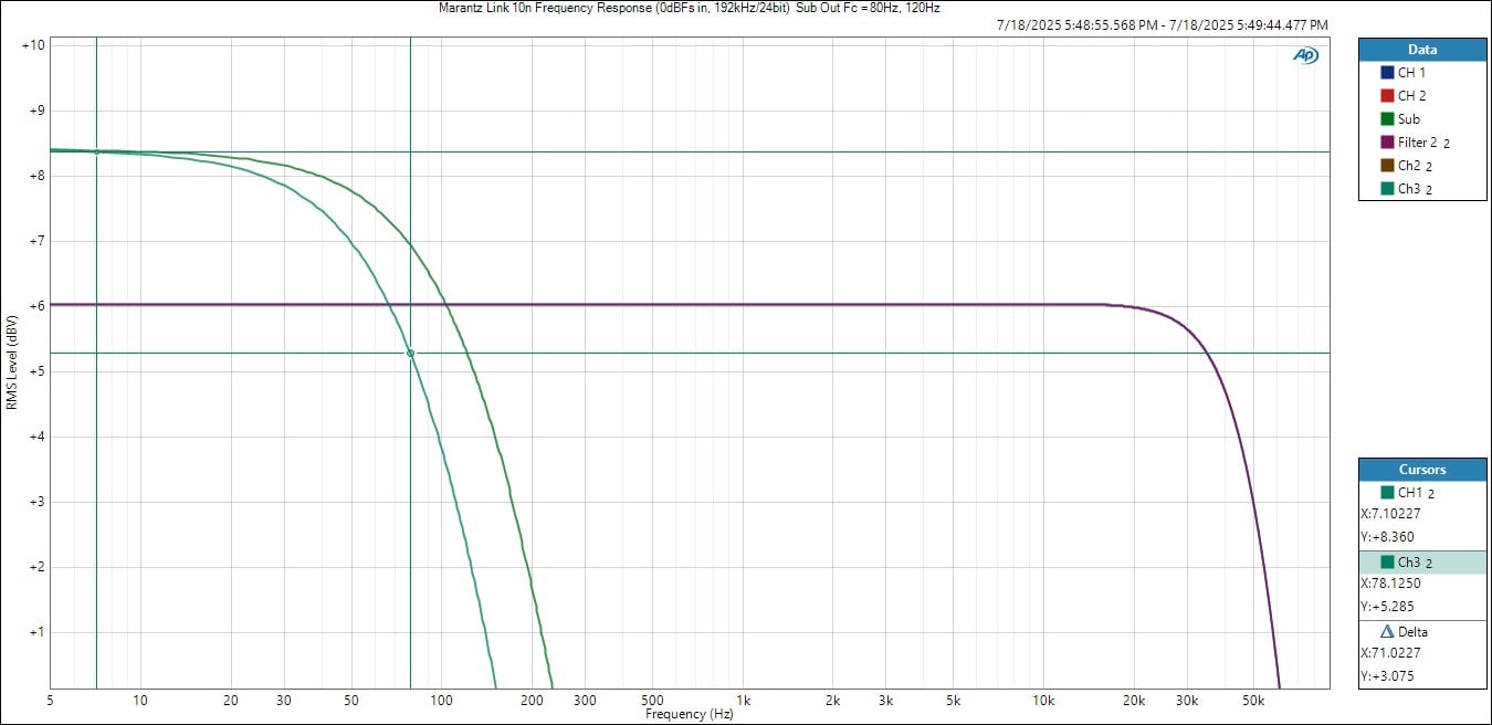 Marantz offers a single RCA sub out on the Link 10n which is odd considering the fact that this product is a fully differential balanced design, but the sub out is NOT! Nonetheless, I measured the output to be about 2.3dB hot compared to the XLR outputs, Fc is adjustable in increments of 20Hz from 40Hz to 120Hz but the filter slope is only 6dB/oct at the crossover frequency but then exhibits close to a 12dB/oct slope at higher frequencies. If you’re going to use the sub out, set it to the max setting of 200Hz and use the internal crossover of your subwoofer (if available) instead.