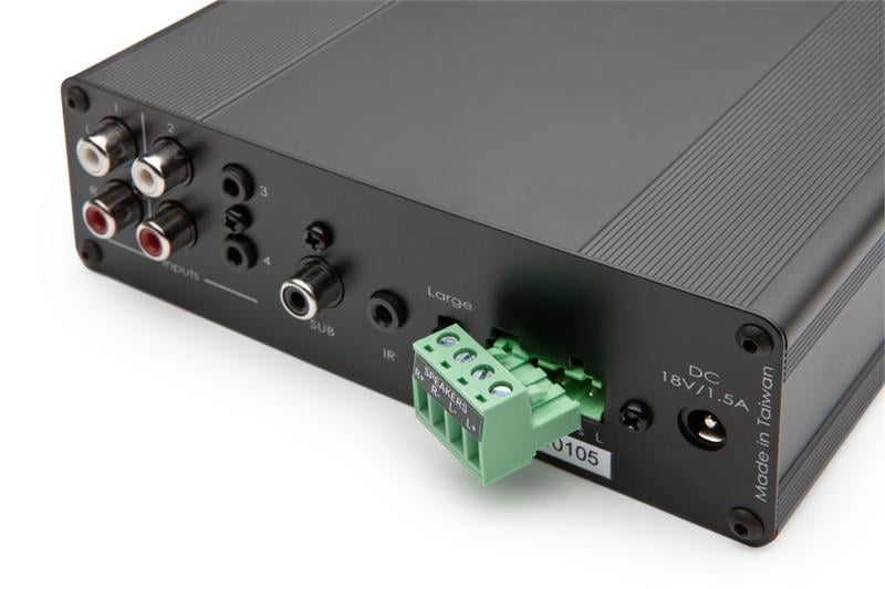 We were particularly impressed to see four inputs (two RCA analogue and two 3.5mm) plus a subwoofer output. Hard to see in the picture above is a switch that sets your speakers from Large to Small presumably to enable or defeat an internal crossover (hopefully set at 80Hz). A subwoofer output allows for a full 2.1 system and an IR input allows you to add the Booster Mini Amp to your universal remote setup.