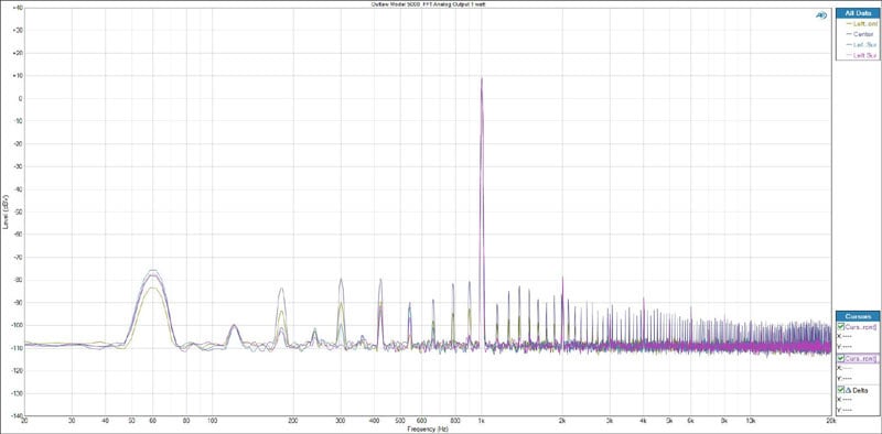 I ran FFT distortion plots at 1 watt and full rated power to determine how clean this amplifier really was. My measurements revealed a pesky ground loop between the Model 5000 and my test gear since the Model 5000 uses a two-prong AC connection and my test gear uses a three-prong which is NOT transformer coupled to float the ground. Unfortunately the Model 5000 does NOT have a physical chassis ground so I tied an alligator clip to the chassis vents on the top cover to the ground pin of my APX585. This resolved the groundloop on all channels except the one closest to the power transformer which was labeled as the “Left” channel. I requested that Outlaw should look further into this and include a chassis ground on future builds of this amplifier to help their customers resolve system ground loops which usually can be eliminated by connecting the chassis ground of all equipment to a common point which is commonly referred to as a STAR grounding scheme. In addition, they could have paid a little more attention to board layout to bring the power supply capacitors closer together to minimize trace impedance and thus tightened up the ground connection a bit better.