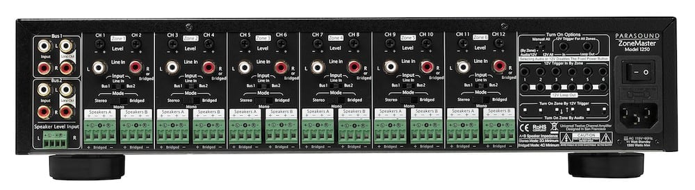 As you'd expect from a distribution amp, the Parasound ZoneMaster Model 1250 has two "Bus" inputs that can be routed to any of the amplifier channels. The Parasound 1250 has 12 channels rated at 50 watts all channels driven. Each channel can be fed from one of the Bus inputs or from a direct input. The 1250 can also accept a speaker-level input via the second Bus channel that can be routed to any of the amplifiers.