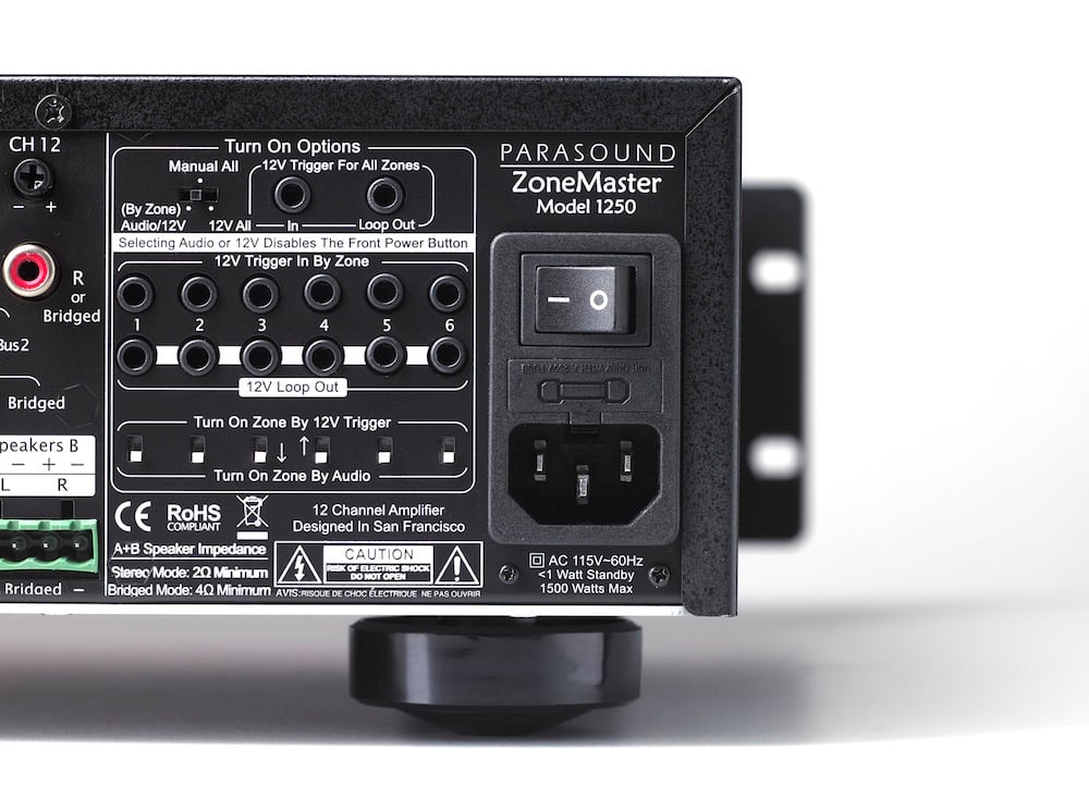 Each channel has not one but two pairs of speaker level outputs (Phoenix-style) so that two speakers can be wired to the same channel. These speaker outputs can accept up to a 12 gauge wire. As the Parasound ZoneMaster 1250 is stable into 2 ohms, this allows extreme flexibility for your speaker options in your distributed audio system. It has a Class A/B input stage and Class D power stage for extremely efficient operation. There are also independent 12-volt triggers with looping trigger outputs for each zone, and a global 12-volt trigger.
