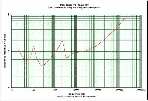 Please refer to the following two graphs supplied by Dick Pierce of one speaker and one tweeter showing the impedance of the speaker and tweeter out to 2 Mhz.