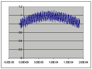 The scope shot provided in figure 2 has "zoomed in" on a small part of the output 1 kHz sine wave output wave to show the maximum output ripple, which is approximately 4 volts peak to peak at approximately 100 kHz.