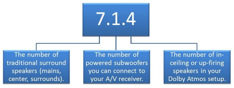 - 7.1.4: A standard 7.1 setup with a front and rear pairs of in-ceiling/ceiling-mounted speakers.