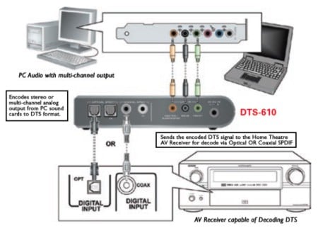 Using the DTS-610 allows the DTS Interactive encoder to turn any PC game (typically using EAX surround) into an interactive DTS gaming experience. Excepting Dolby Digital LIVE, previously, the only way to get rich 5.1 surround out of PC games was to run 6 analogue cables into the 5.1 multi-channel inputs of a home theater receiver. The main problem with this was the fact that most receivers only have one set of multi-channel inputs and many times those are occupied with the 5.1 outputs of universal DVD players for support of SACD and DVD-Audio.