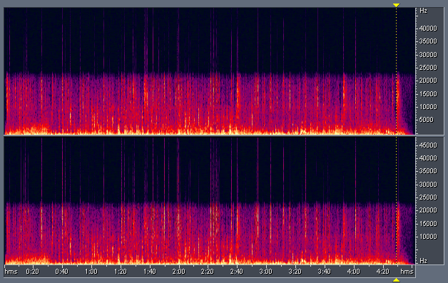 Notice, again, the severe drop off above 22kHz. In comparison, the EAC rip at around the same point is similar, but without the ultrasonic noise: