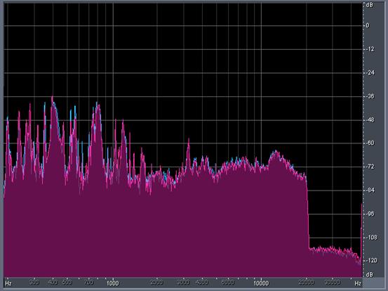 The SACD layer exhibits exactly the same brick wall at 20kHz but layered with the rising DSD ultrasonic noise from about 24kHz onwards: