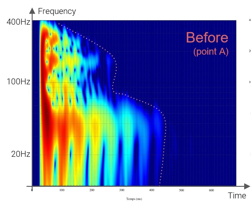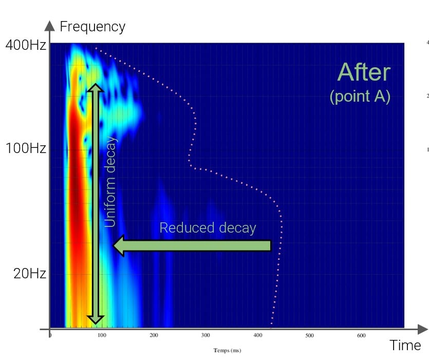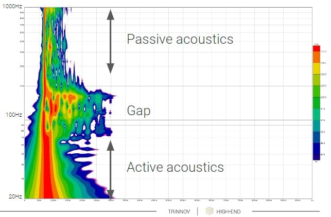 Let's address the next myth. Contrary to popular belief, Trinnov does NOT claim that this technology renders room treatments obsolete. On the contrary, room treatments are now more crucial than ever. The truth is, bass traps are not particularly effective. They exhibit inefficiency, and active methods like MSMC are far superior in dealing with bass damping. However, this technology does have its limitations. Beyond those limits, traditional passive absorbers are essential. The challenge lies in achieving the right balance between active absorption and passive absorption. It is not sufficient to simply hang panels on the wall and consider the job done. The result would resemble the figure below.