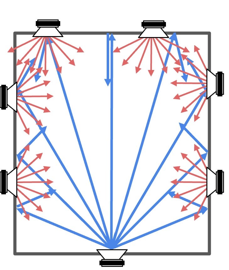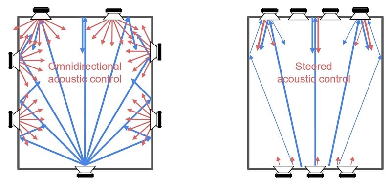 MSMC relies on sound design principles to prevent the formation of acoustic problems. While beamforming a narrow bass beam that specifically covers the seating area (rather than the side walls) is one viable approach, the planewave method offers the best solution. Moreover, a planewave can be easily canceled out by an opposing planewave with equal and opposite power. The traditional approach to DBAs involves applying simple DSP techniques, such as sending an inverted signal to the rear array with an appropriate delay matching the room's length. However, DBAs tend to work effectively only in perfect rooms and struggle when the room deviates from ideal conditions, such as incorporating a riser or having a non-rectangular shape. DBAs are also highly sensitive to misalignment.