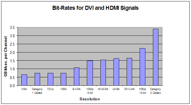 But from a digital engineering standpoint everything is bitrate. And with that, we begin our discussion. With respect to high-definition video quality and resolution, 720p or 1080i is the first "bus stop" at 742.5 Mbit/s. Those resolutions describe 742.5 million bits of information traveling through the digital pipeline each second. A lot of AV receiver chipsets handle these resolutions with no problems at all. ALL HDMI cables that aren't made in someone's garage will pass this level of bitrate for a considerable length.