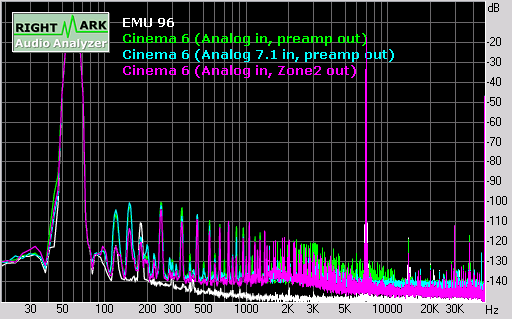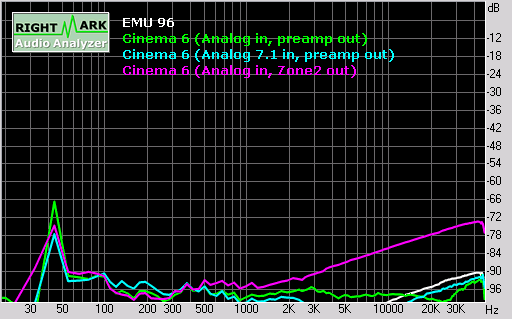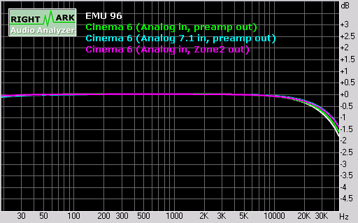 These are Audio Rightmark results of the Cinema 6 when fed a digital signal via the D-VCR coaxial input at 44.1, 48 and 96 kHz sampling rates (the E-MU 1212M in external analog loopback mode is provided as a reference):