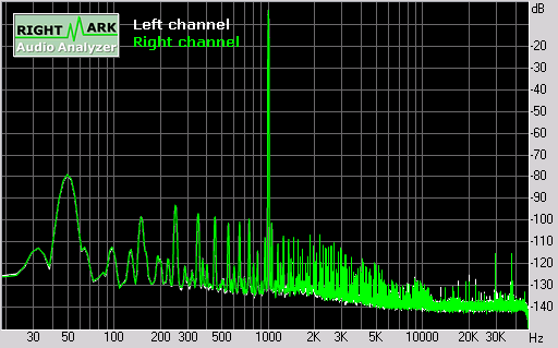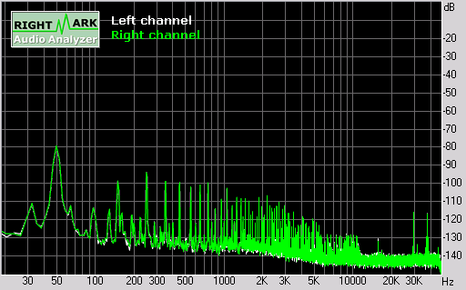 The noise floor was convincingly below -100dB, with the main contributor to noise being the residual 50Hz spike from the power supply and harmonics of 50 Hz (primarily 150 Hz, 250 Hz, ...) There seemed to be a few spikes around 17 kHz and above 30kHz: