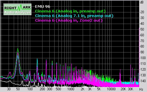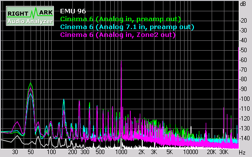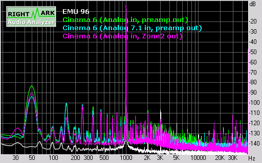 The unweighted dynamic range was around 86 dB and the A-weighted dynamic range was around 101 dB. Not quite the 110dB claimed in the manual but not bad for a pre/pro.