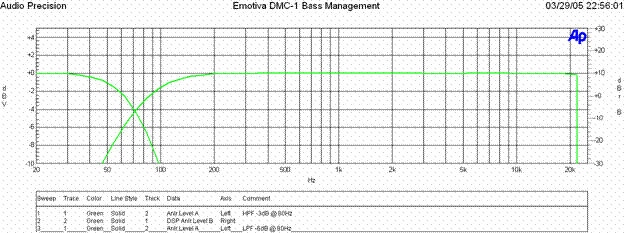 When all crossovers are set to 80Hz, we see a perfect 12dB/oct HPF rolloff and -3dB @ 80Hz for all speakers set to "small", and 24dB/oct LPF rolloff and -6dB @ 80Hz for the sub/lfe channel as per THX recommendation. In most cases, this is the optimal configuration that you should at least use as reference point, only varying if your particular speaker system and/or room integration requires it.