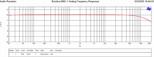 The frequency response via the analog outputs of the DMC-1 are ruler flat out to about 50kHz with a -3dB point of around 200kHz.