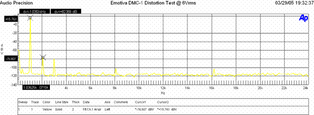 When the analog preamp was driven at 6Vrms (more gain than you should ever need to drive any power amp to maximum power) distortion levels were (+.15.761 + 76.607)dBv = 92.368 or 100*alog(-92.368/20) = .00241%. Again this is excellent performance and indicates distortion is not an issue with this preamp at any unclipped drive level.