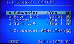 null Having used the Onkyo TX-SR601 receiver for a number of weeks prior to this review I was fairly familiar with the Integra's similar setup menus and configuration methodology. I think that Onkyo/Integra has one of the most straightforward OSD systems for all major settings, though you can certainly drill down into the menus quite a bit for some of the more obscure adjustments you may wish to make. Going through the On-Screen Display (OSD) I was able to easily set up the receiver and customize the DTC-9.4 to fit the required metrics of my listening room. I configured the bass management to cross over at THX' recommended 80Hz and set the speaker configuration as shown here.