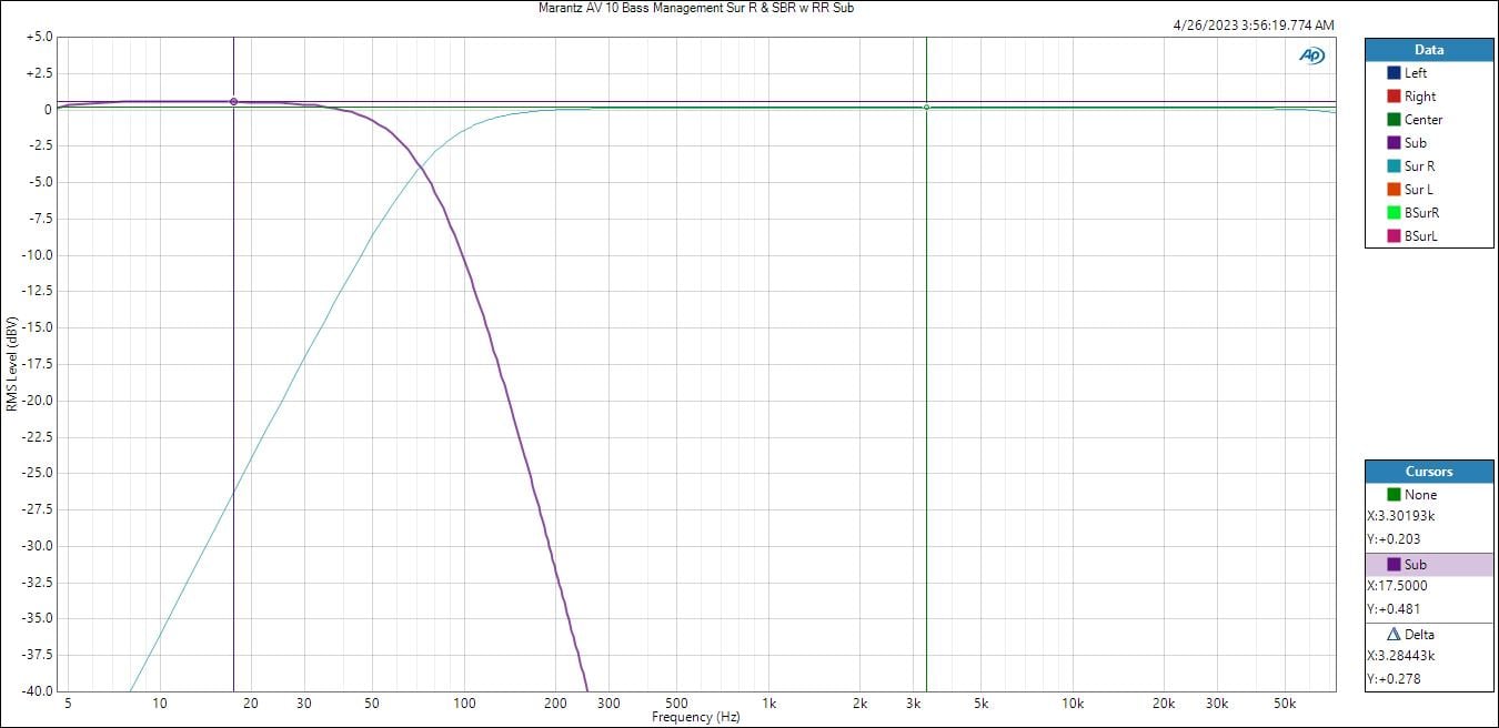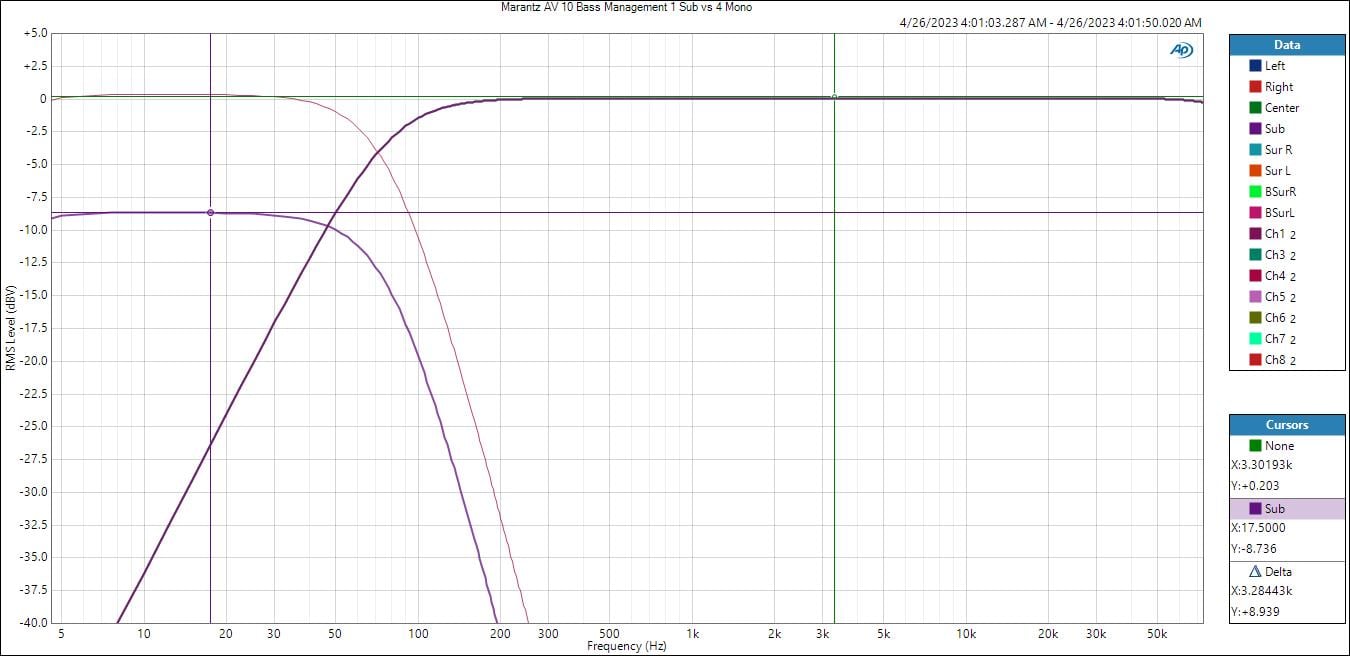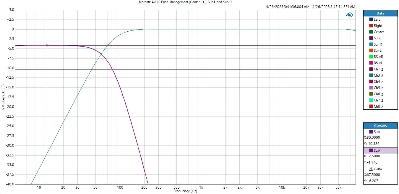 The Marantz AV 10 bass management engaged with a crossover point of 80Hz resulted in textbook THX slopes of 12dB/oct HPF response for bass managed speakers and 24dB/oct LPF. The variable crossover feature also works as expected and is a useful tool for calibrators that can potentially get better integration between the speakers and subs if 80Hz is not the ideal setting for every channel grouping.