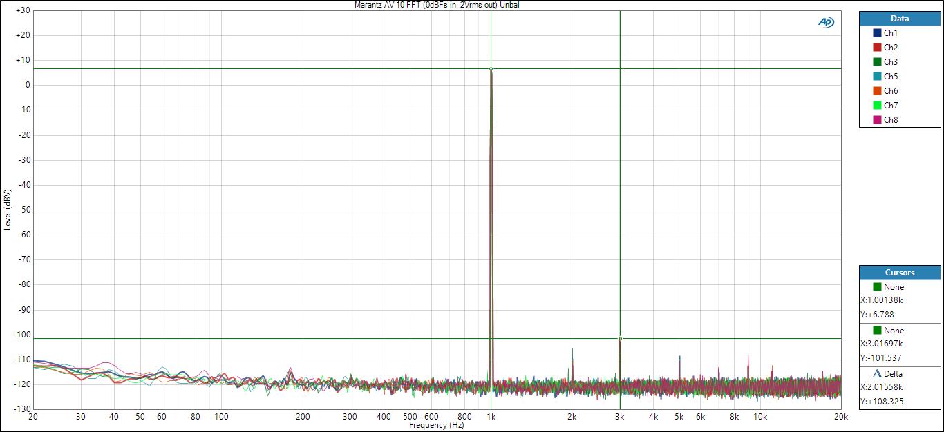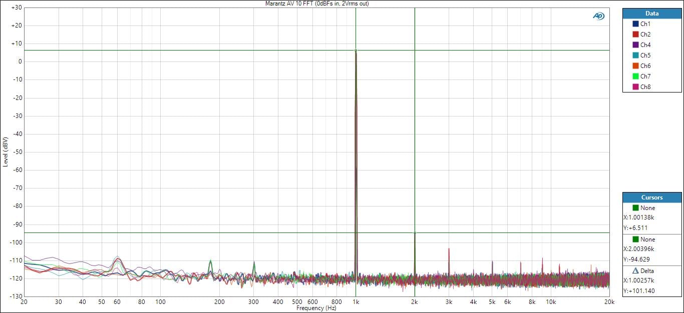 No surprise, we see a squeaky clean FFT distortion plot when measuring the entire analog audio path of the Marantz AV 10.