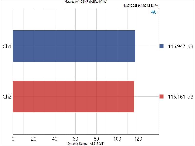 When I tested in the exact same test conditions of Marantz (0dBFS input, 4Vrms output), I confirmed their 116dB SNR measurement! I was able to get the same measurement with and without Pure Direct engaged.
