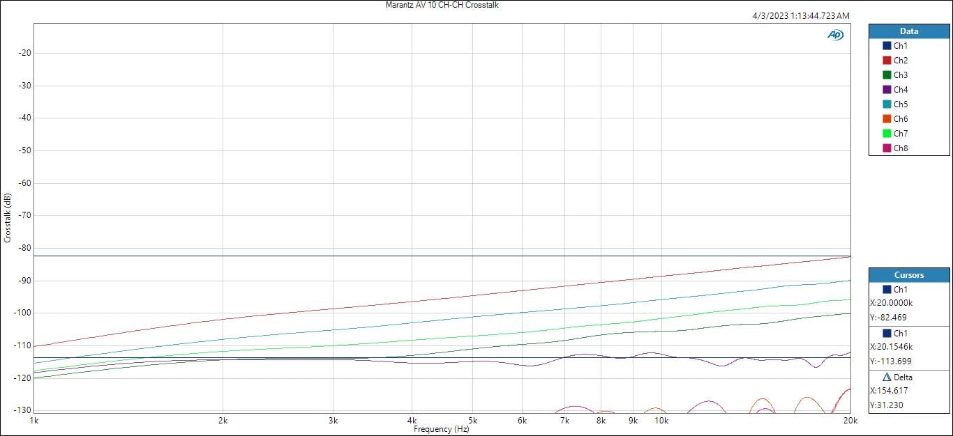 112dB SNR @ 2Vrms with a 0dBFs input signal is excellent and among the best I’ve measured from AV processors. I remeasured at 1Vrms via the unbalanced outputs and the AV 10 achieved similar results. Ignore CH4 which is the subwoofer channel. When I tested in the exact same test conditions of Marantz (0dBFS input, 4Vrms output), I confirmed their 116dB SNR measurement!