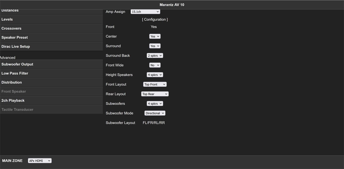 Nonetheless, the Marantz AV 10 stands out as the ONLY 15.4 processor on the market that we are aware of, offering 4 independent subwoofer outputs, LFE bass routing to the main channels, and 2 major room correction systems (Audyssey and Dirac). We hope that Marantz will continue to support firmware updates for the AV 10, as they have been doing, and we would love to see Dirac ART implemented next.