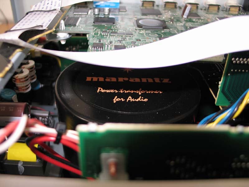 I actually bought this unit for myself, so I didn’t feel very comfortable taking it apart. But curiosity got the best of me. The AV7005 is built rigidly and a big proprietary power supply immediately stands out. A heavy-duty casing to prevent signal leakage encases it, labeled “Marantz Power transformer for audio”. If my sources are correct, this is a copper shielded EI core power transformer. The AV7005 has a symmetrical HDAM layout and gold-plated relays on the power supply board, though I couldn’t locate them myself. The pre amp section is located near the front panel and is mounted on a steel base plate (1.2 inch thick) that acts as an electromagnetic shield. Main capacitance is provided by two 3300 µF @ 25 volts audio capacitors, built by Elna. These are specifically designed audio capacitors from their “For HI-FI” LPO series II range, costing $10 each. Next are five smaller 100 µF @ 50 volts Elna SILMIC capacitors. Quite impressive, wouldn’t you agree?