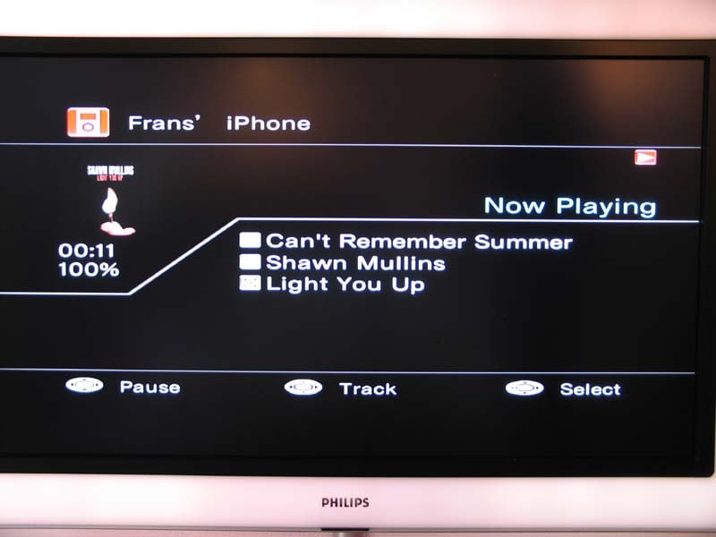 Again, I really dig the OSD interface, though the album art is a bit small. When browsing a playlist, there are seven songs displayed alphabetically per page. Use the remote to go up & down a page. Simple and effective, it beats Apple Front Row's solution that "glides" through a playlist. There, I "over-slide" the song I'm looking for EVERY single time. Loading time of a page could be quicker but still the lag isn’t too bad. However, you will over shoot pages if you try to browse through them too quickly.