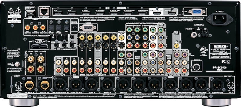 The PR-SC5508 is a flagship product so expect it to come stuffed full of features. Onkyo's budget offerings have been impressing us lately with the number and quality of the features and the PR-SC5508 is no different. To start with, it has THX-Ultra 2 Plus certification, it is network-capable, and supports 9.2 channels of audio. There are RCA and XLR outputs for all channels plus a pair of XLR inputs for integrating high quality two channel gear. There are two USB inputs (one in the front and one on the back) that support audio only. If you want to integrate the video from your iPod, you'll need to buy the extra dock and connect it to the "Universal" port. One thing we really liked seeing was not only Pre-outs for Zones 2 and 3, but dedicated subwoofer outputs for each. Zone 2 also has Component and Composite video output and there are two HDMI outputs. A front mounted HDMI input makes testing out new gear or streaming from one of many HDMI capable hand-held devices much more convenient.